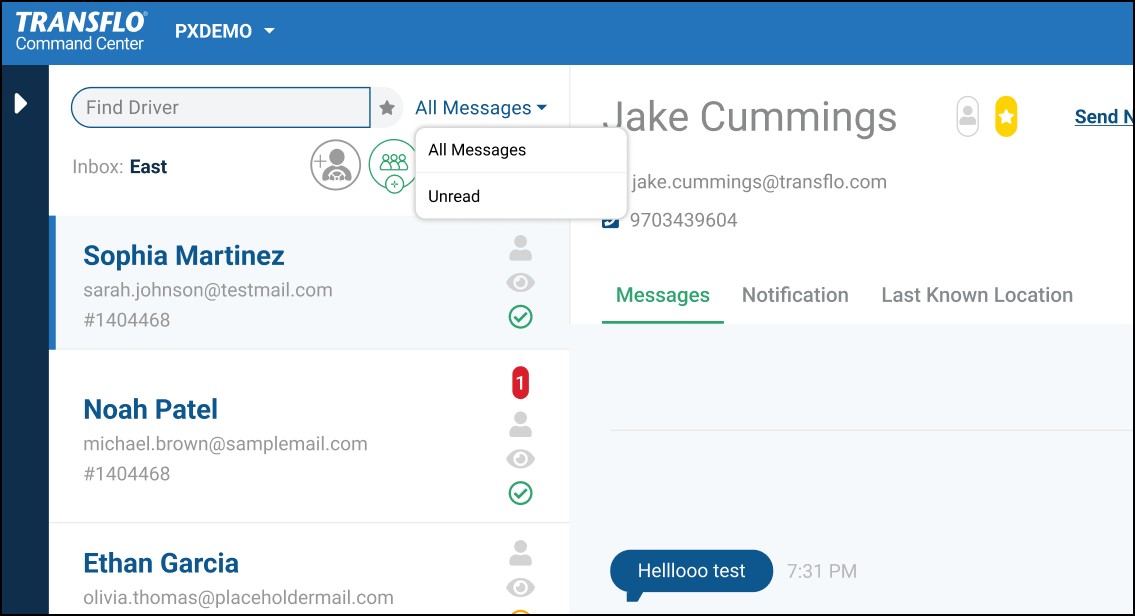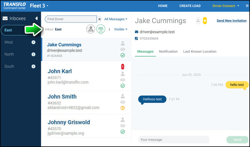 Example A: A dispatcher sends a message to drivers in the East inbox under Fleet 3.
