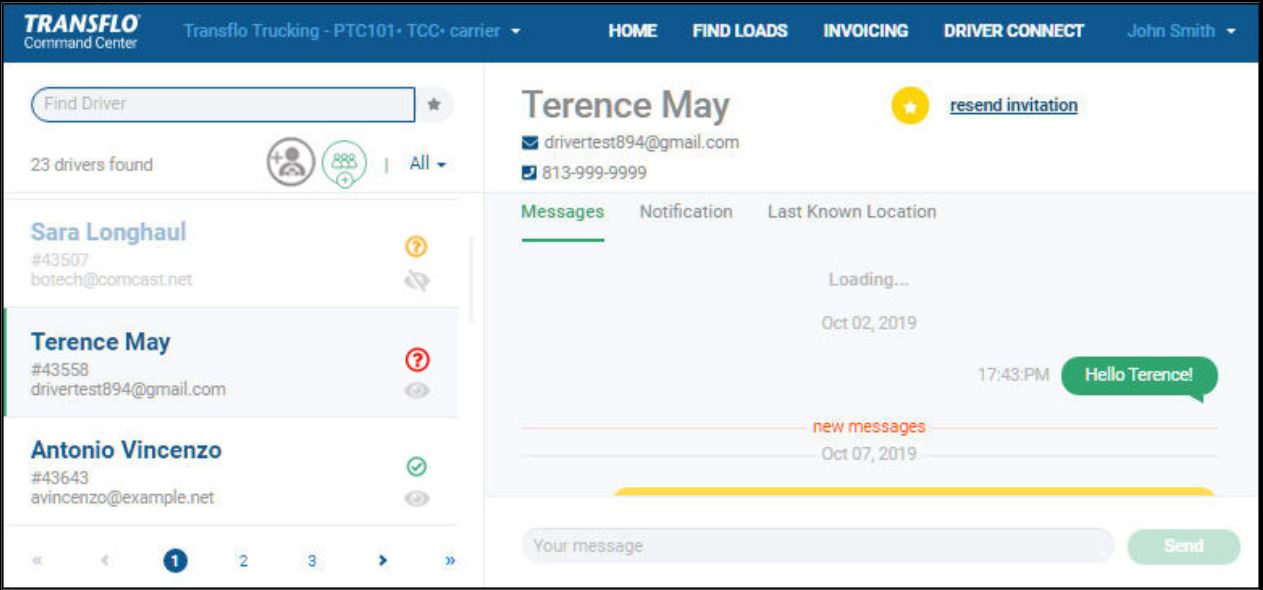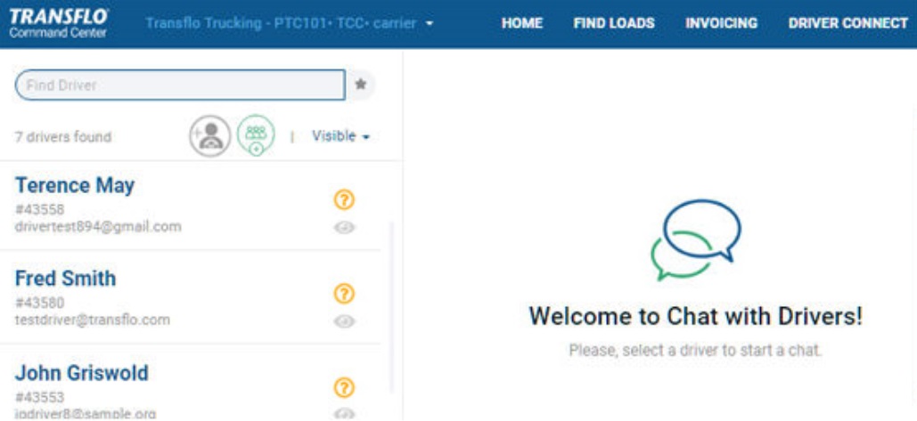 Convenient features on the DRIVER CONNECT page help you find and select a driver. The same features are available in other pages wherever you need to find a driver, for example, when assigning or offering a load. You can search for a driver by name, e-mail, or ID and you can find drivers marked as favorites.