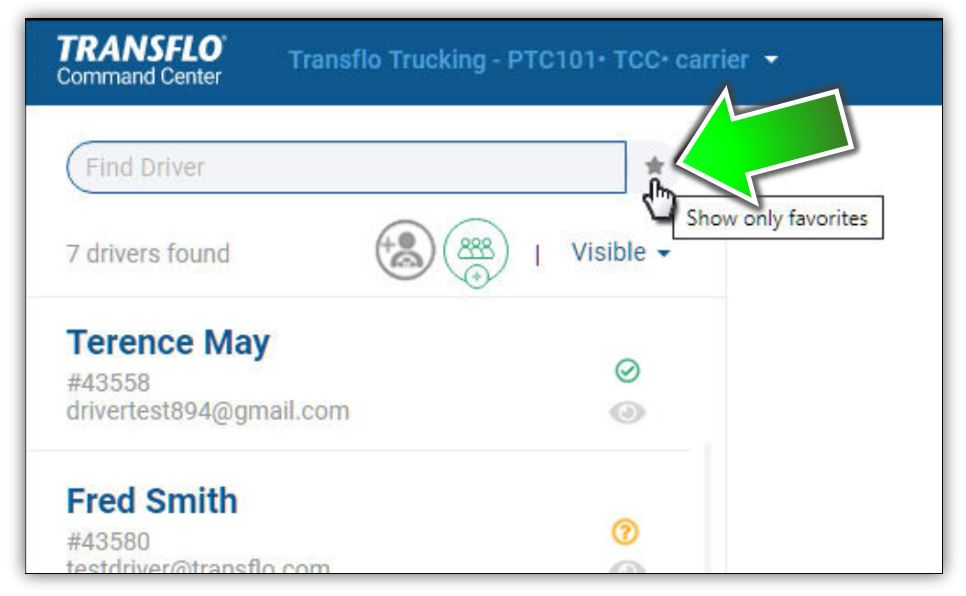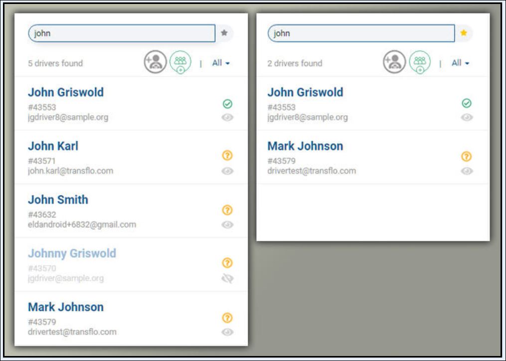 Tip: The sequence given in the previous step is required when you use the Show Only Favorites option. Always enter your search string first, and then click the Show Only Favorites option, in that order. If you click Show Only Favorites first, and then type a name or text string, a new search is performed (and shows all results, not just favorites). To see the favorites with that name, click the favorites icon twice. For example, if you click Show Only Favorites first and then type john, the system shows four (4) matching drivers, but all four (4) are not true favorites.