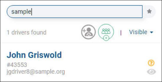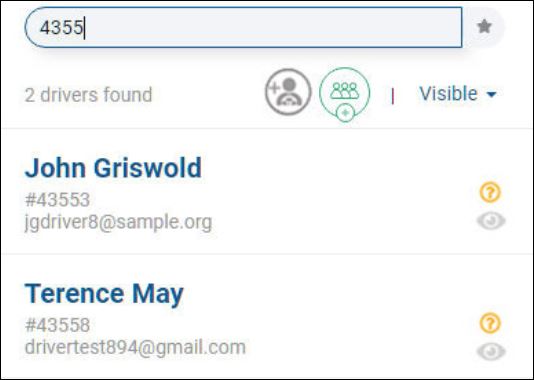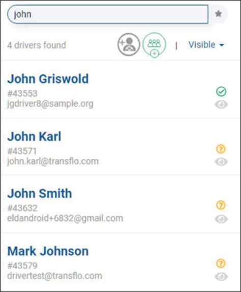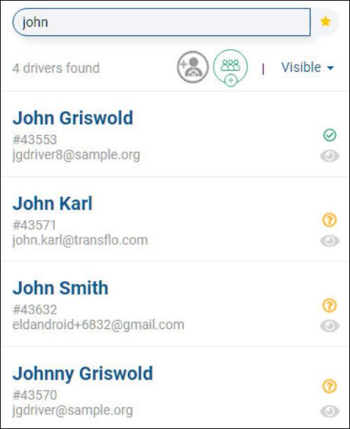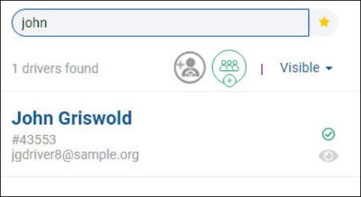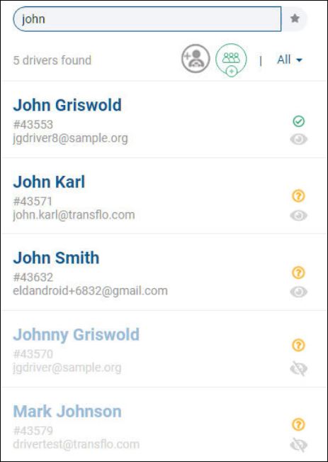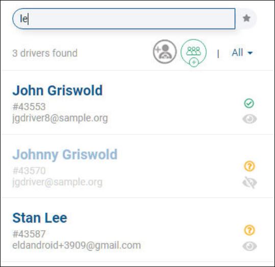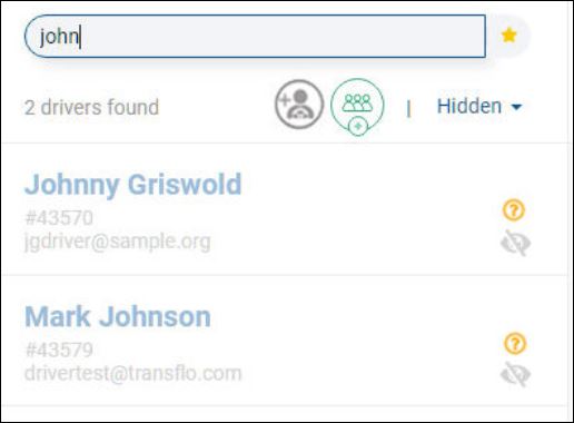 To search by name (first or last) or e-mail address, enter one or more characters. As you type, the system finds matching entries. In this example, a search on john finds four (4) drivers (see 4 drivers found below). Three (3) drivers have a first name of John and one (1) has a matching last name of Johnson.