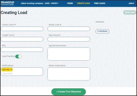 After you have entered the details for the load, click the green + Create First Shipment button at the bottom of the page.