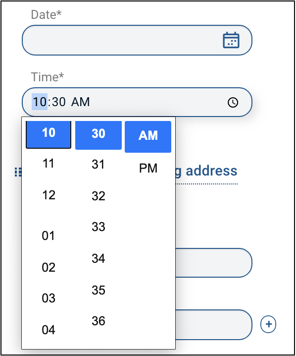 Time: Click on the Hour, Minute, or AM/PM and enter the time or scroll through the numbers.