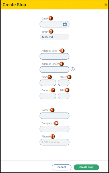 Name, Company, and Phone: Enter the name, company, and phone number for a contact person who can remain available to assist the driver with access or any questions about the stop location. The Command Center application accepts phone numbers in different supported formats; however, as a rule, try to remain consistent.