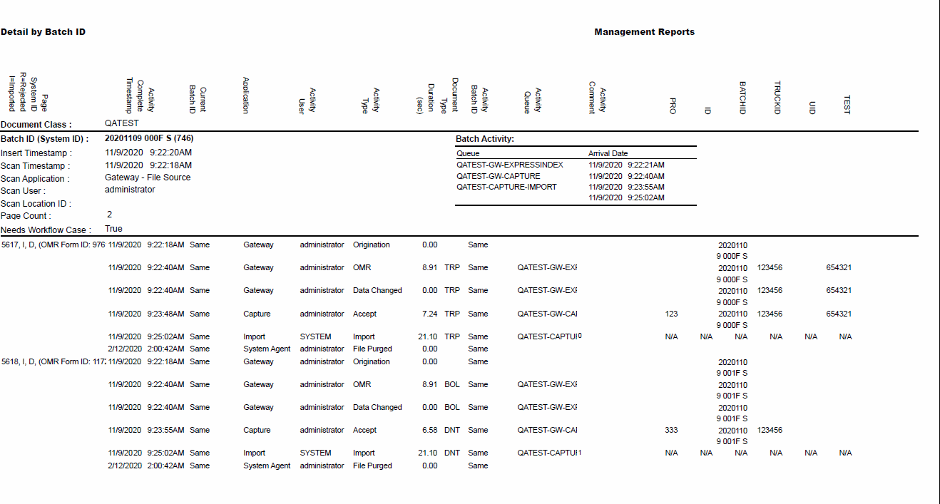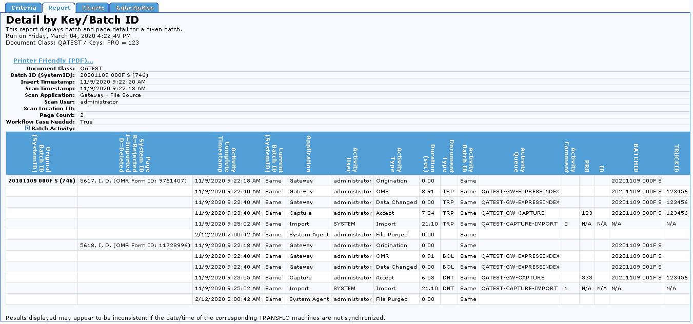 Detail by Key/Batch ID: The Detail by Key/Batch ID report is used to show all activities such as Accept, Import, or Print related to a particular batch. The report tracks the origin application, the date and time when each activity was performed, and the name of the user who performed it (if applicable).