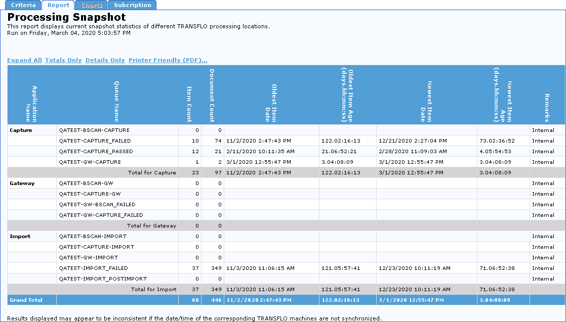 The Processing Snapshot report contains rows displaying column totals for each TRANSFLO® application individually and for all represented applications as a whole.
