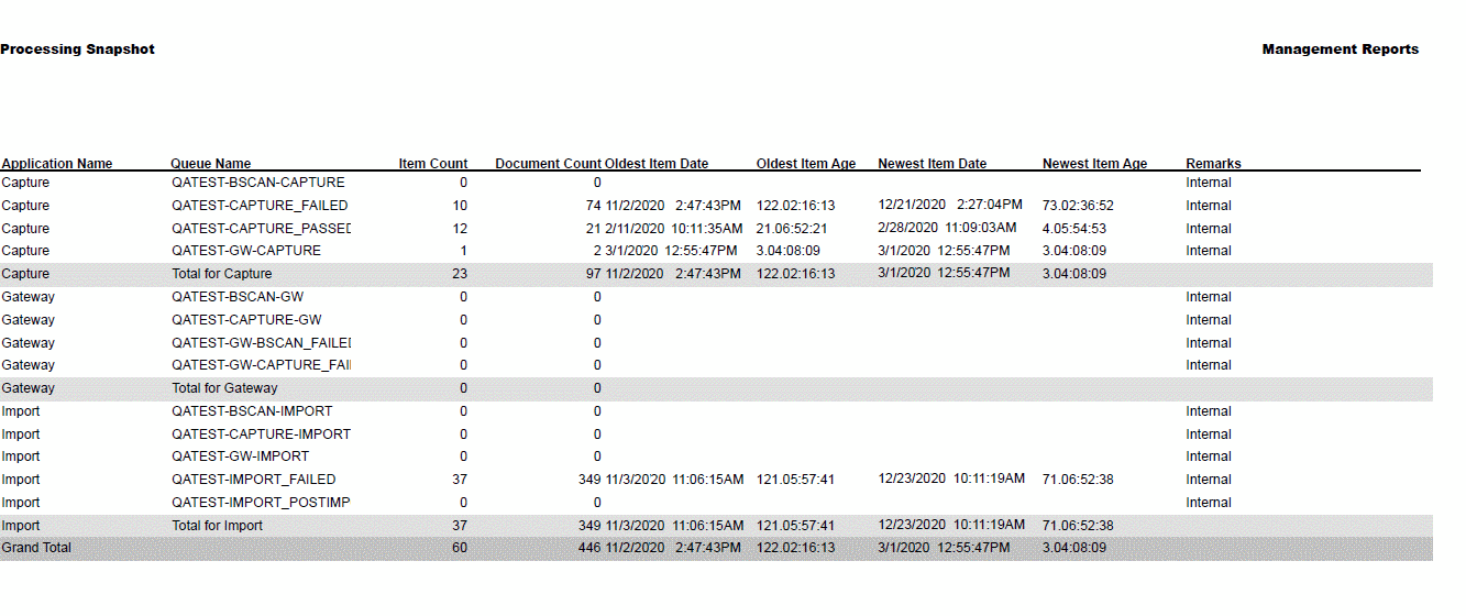 Processing Snapshot: The Processing Snapshot report displays real-time statistics of processing locations in the TRANSFLO® system and is sorted by application. This report tracks the current location of work, the number of Batches in each location, and the number of documents within each batch.