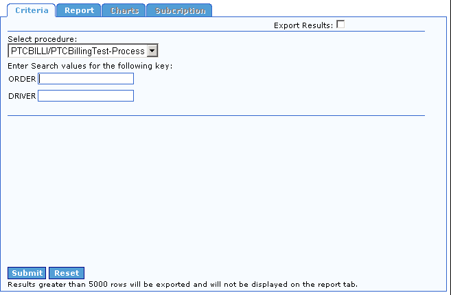 By default, once report criteria has been selected, report data is presented on- screen on the Report tab. An option to export the results to spreadsheet format is available. To export the report as a CSV file viewable with most spreadsheet applications, select the Export Results check box to the right of the date fields.