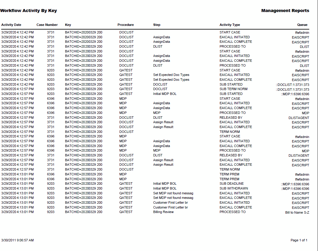 Workflow Activity by Key: This report displays Case history for a given Key value pair. It shows all of the cases, the procedures, Procedures Steps, Queues, Activities and Activity date/times for the given key value.