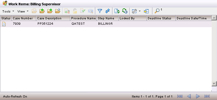It displays whether or not Auto Refresh is on, the number of items in the Work Queue and the selected item’s position in the List, and the number of pages of Work Items in the Work Queue.