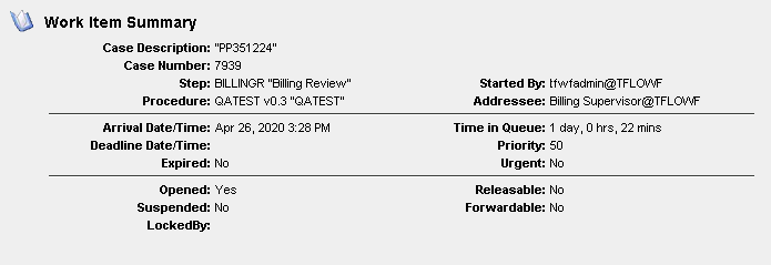 Opens a window with details about the Case. This window has a Summary tab, a History tab that shows all of the steps the Case has gone through, an Outstanding tab and a Data tab with the fields and current values. |