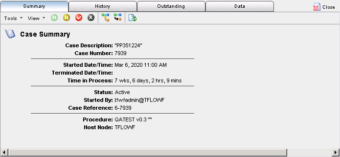This tab has a toolbar that allows you to Activate, Suspend, Close, and Purge Cases, Trigger Events, Process Jump, and Refresh the Case information.