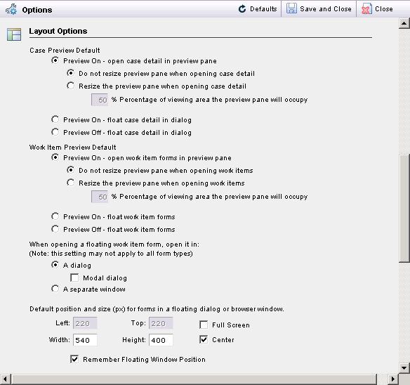 Configure the initial layout of your Cases and Work Items and the default parameter for floating Work Items.