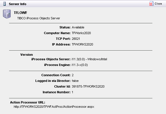 The URL used for administering the iProcess Engine is also provided in the Action Processor URL field.
