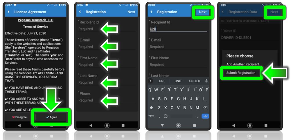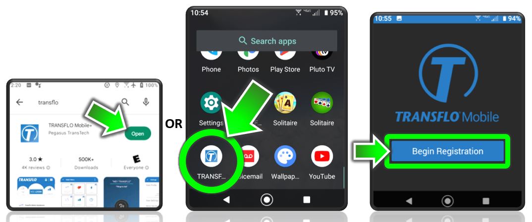 After it installs, tap Open. If you get distracted by another text message or phone call, you can tap the Transflo app on your device to open it just like any other app. Tap Begin Registration.