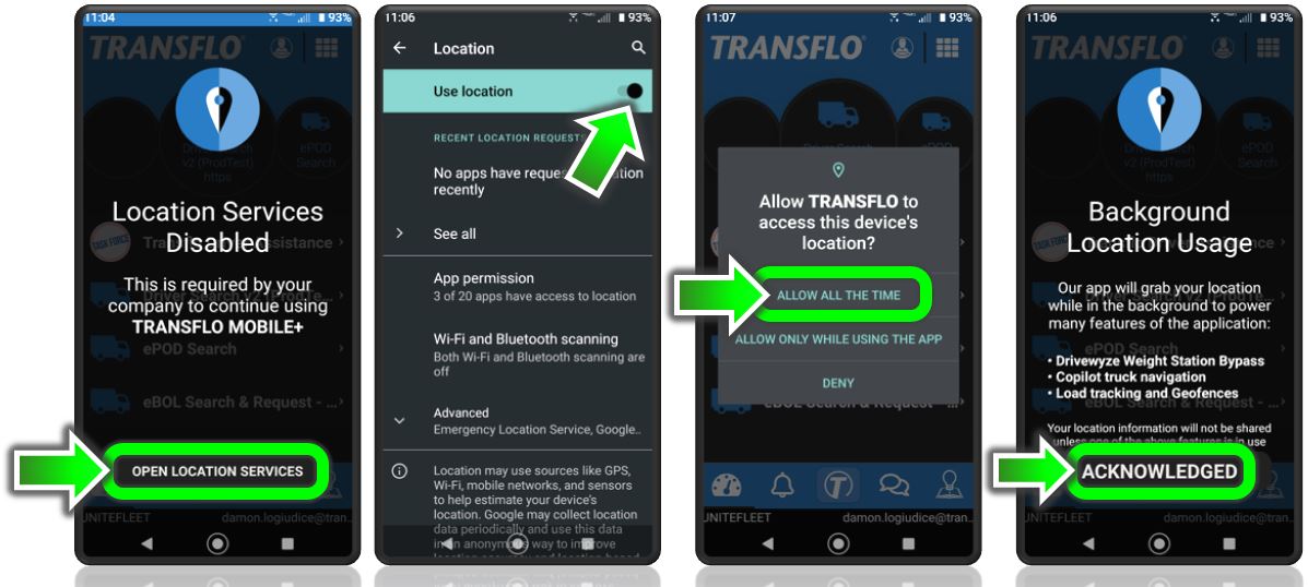 At the Allow TRANSFLO to access device location? confirmation message, tap ALLOW ALL THE TIME. Without this setting, you won't be able to take advantage of the location services, GeoFence, and shipments the shipper expects you to see. Only those drivers who are connected by data plan or a wide area network for Wi-Fi can view the shipments and exchange documents in real-time.