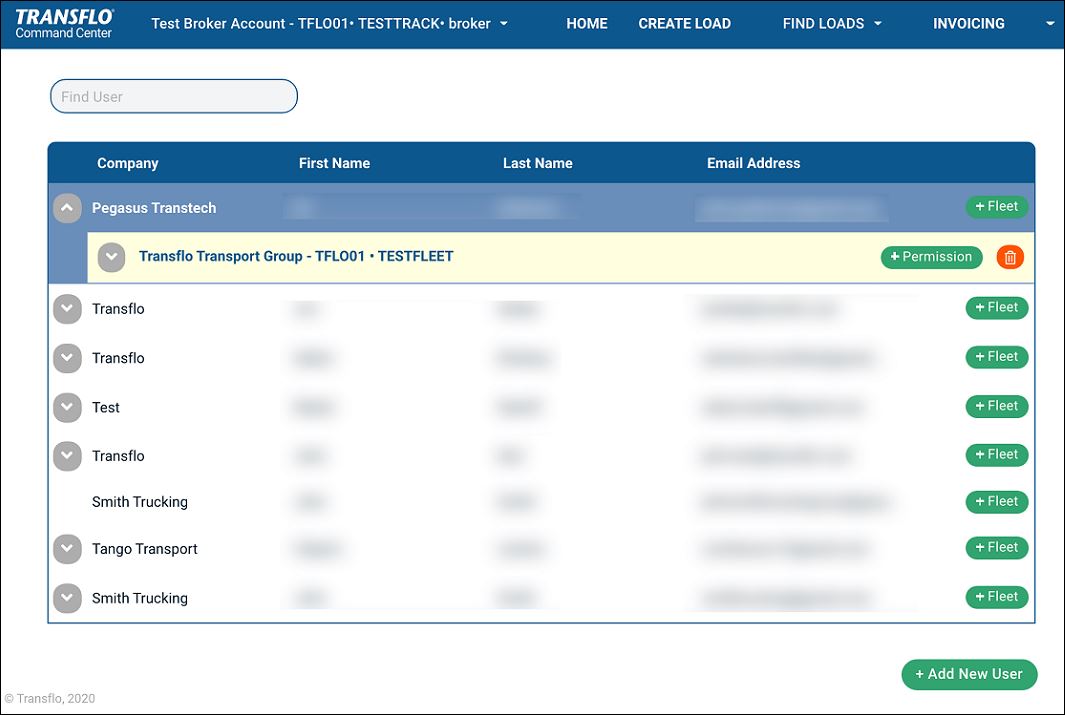 To refine the list of carriers and brokers (essentially these are other users just like you), enter a full or partial search string in the Find User field at the top of the page.