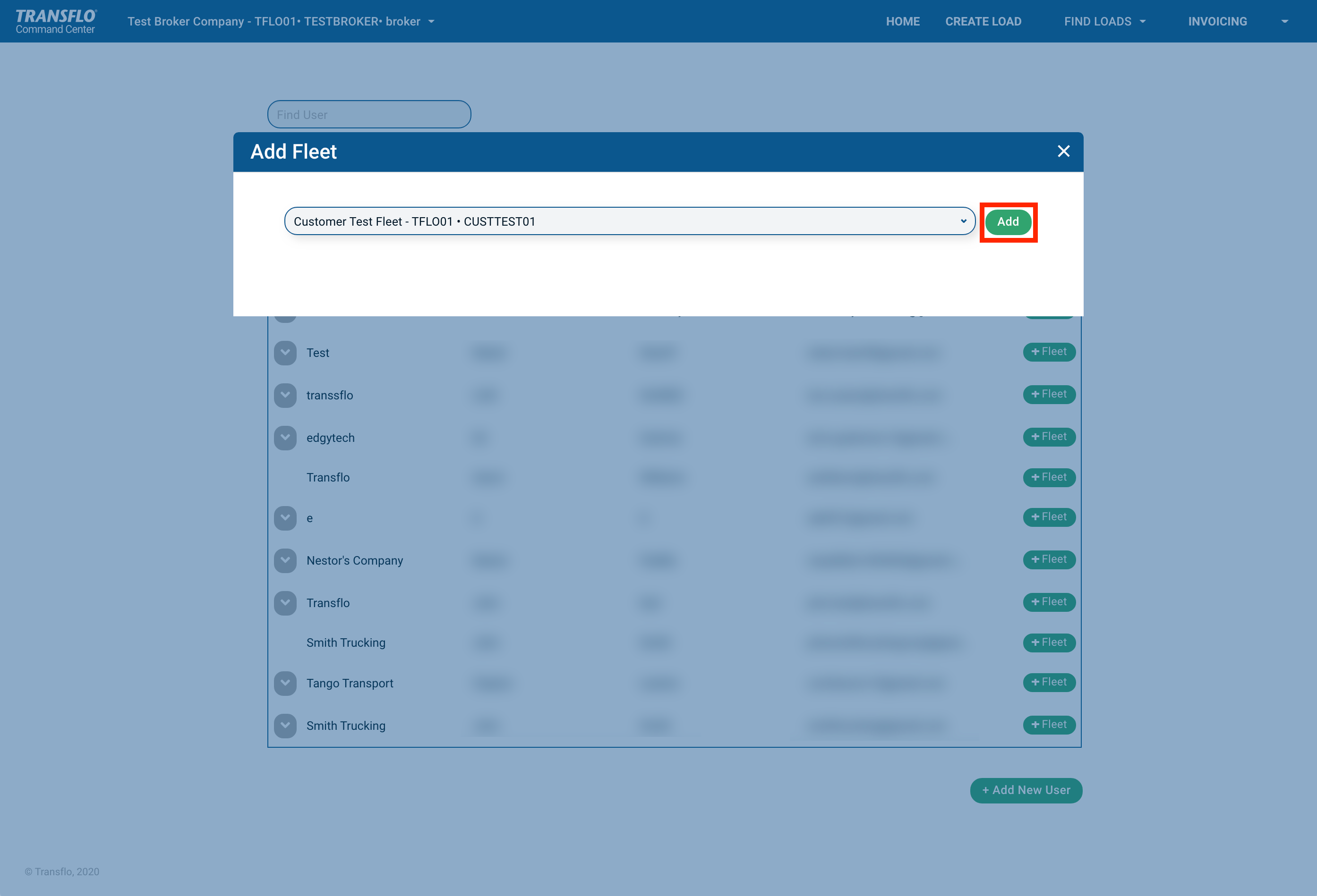 To associate a fleet, carrier, another broker, or shipper, click the green + Fleet button and then click the drop-down
