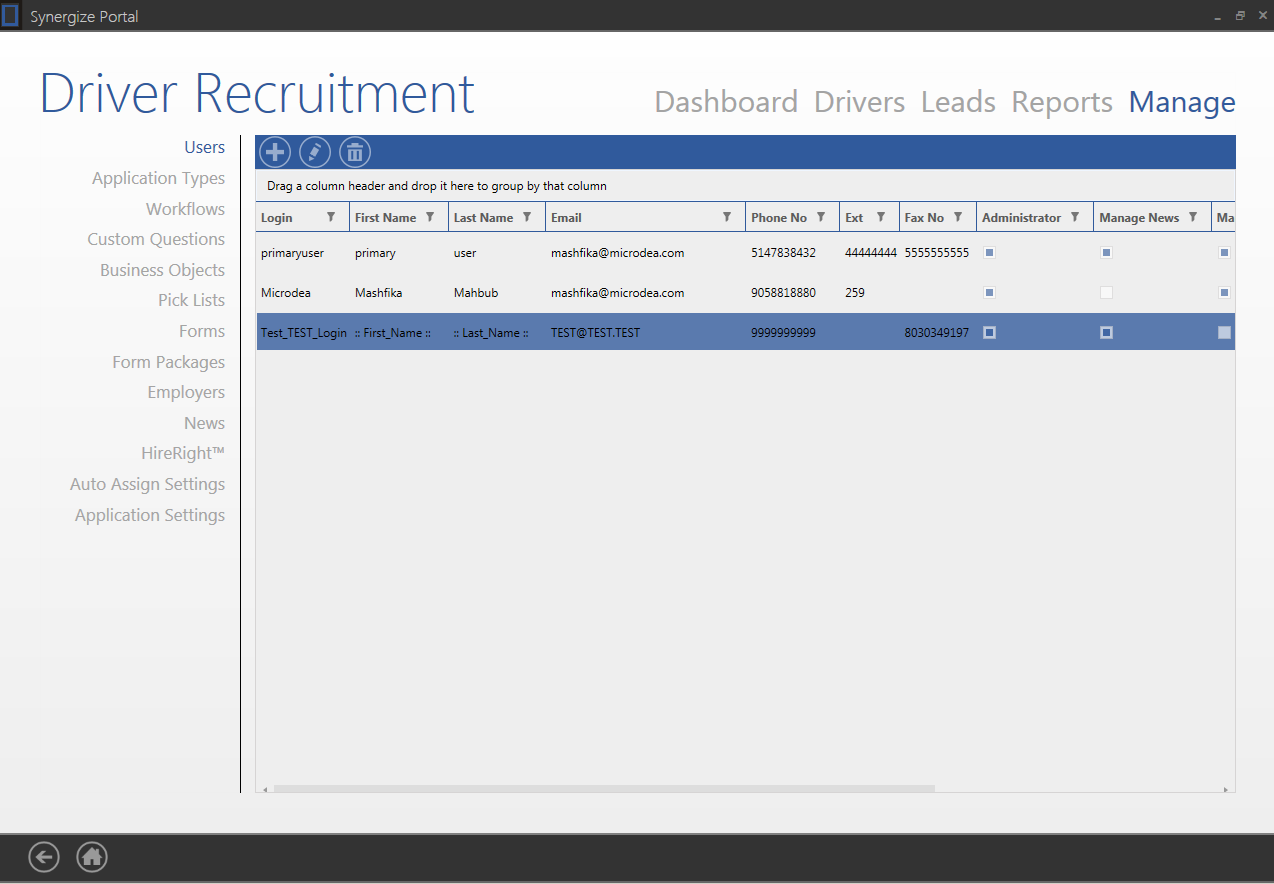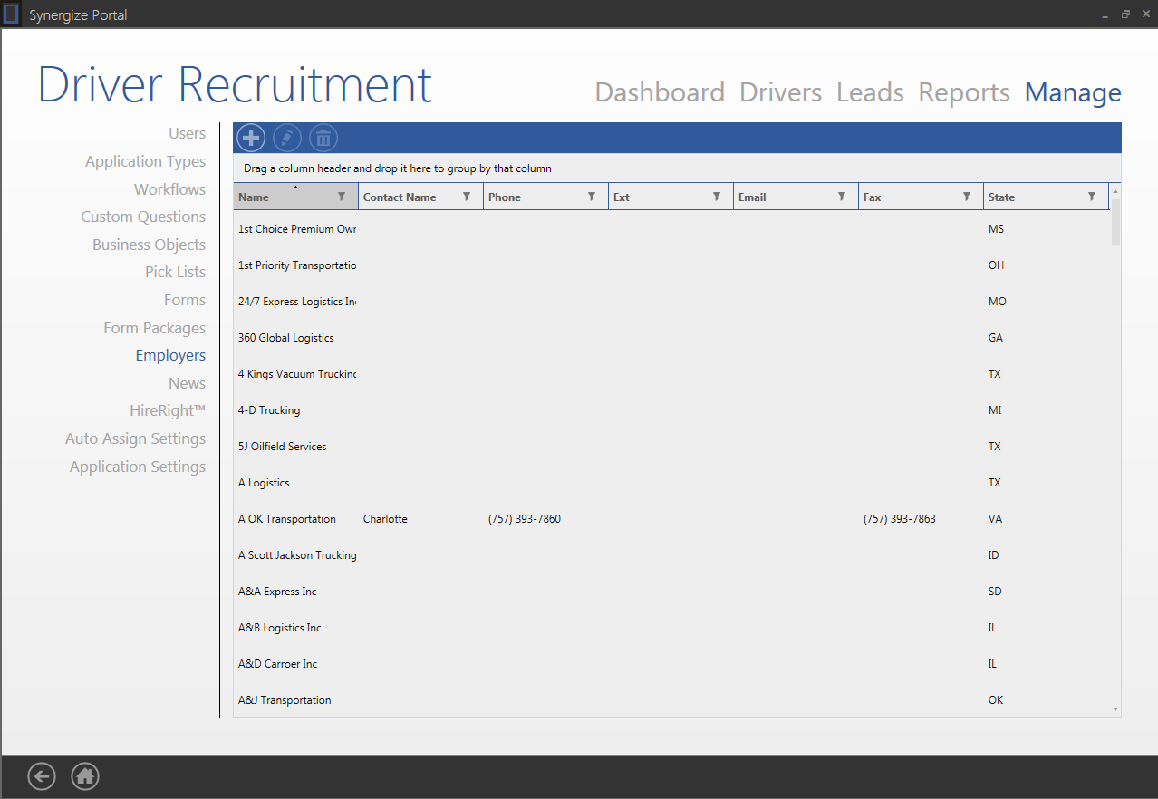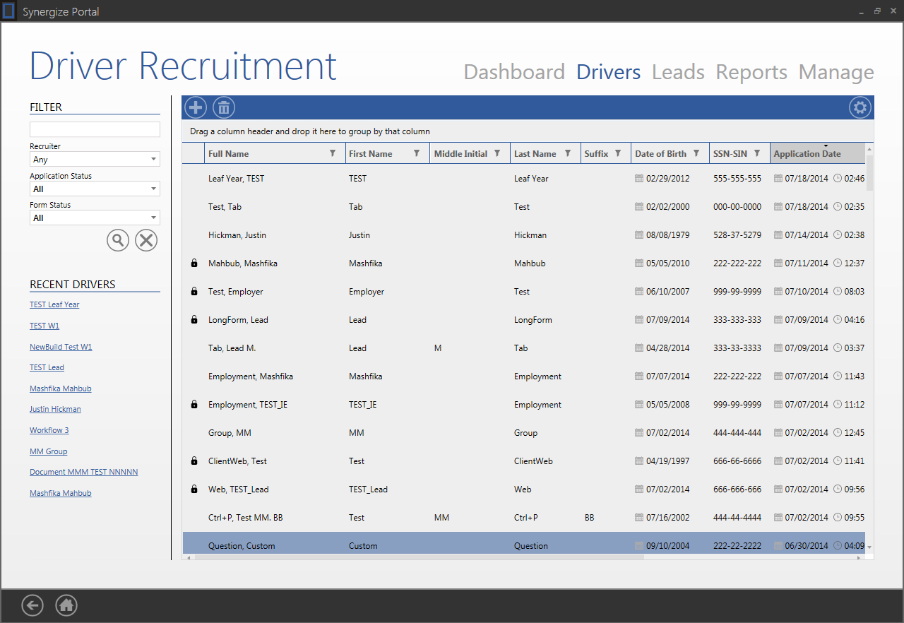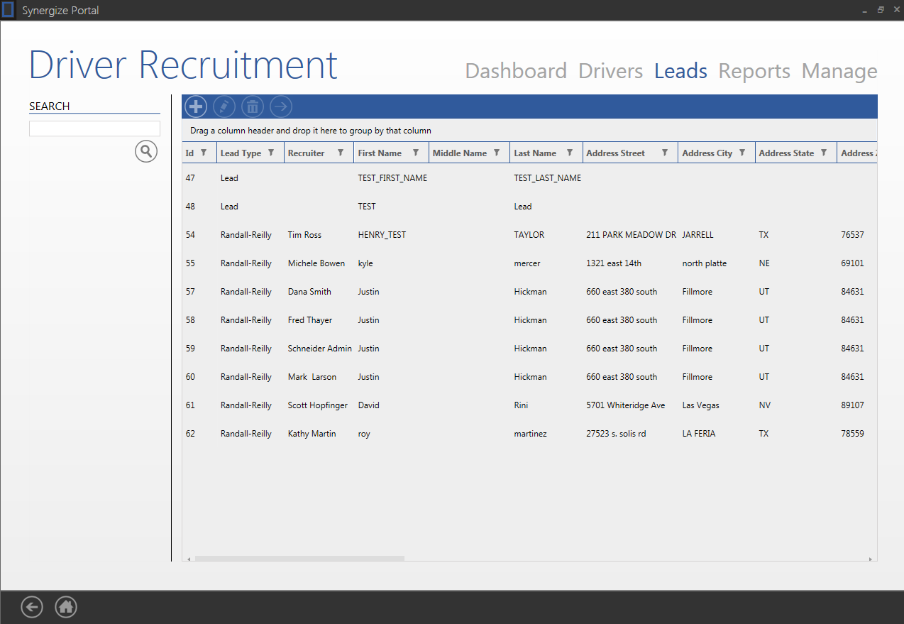 The Drivers Grid View is the first screen shown to the recruiter, when the Drivers tab is selected from the Driver Recruitment Dashboard. Recruiters can add or delete drivers, search and filter drivers, sort and group drivers by fields, view recent drivers, or select and view a driver full profile. One hundred drivers are shown per page.