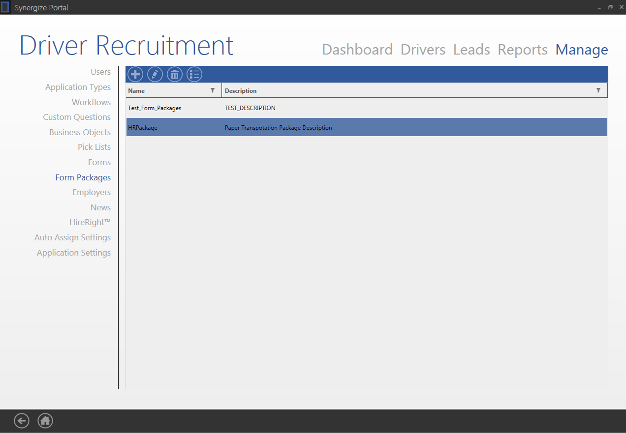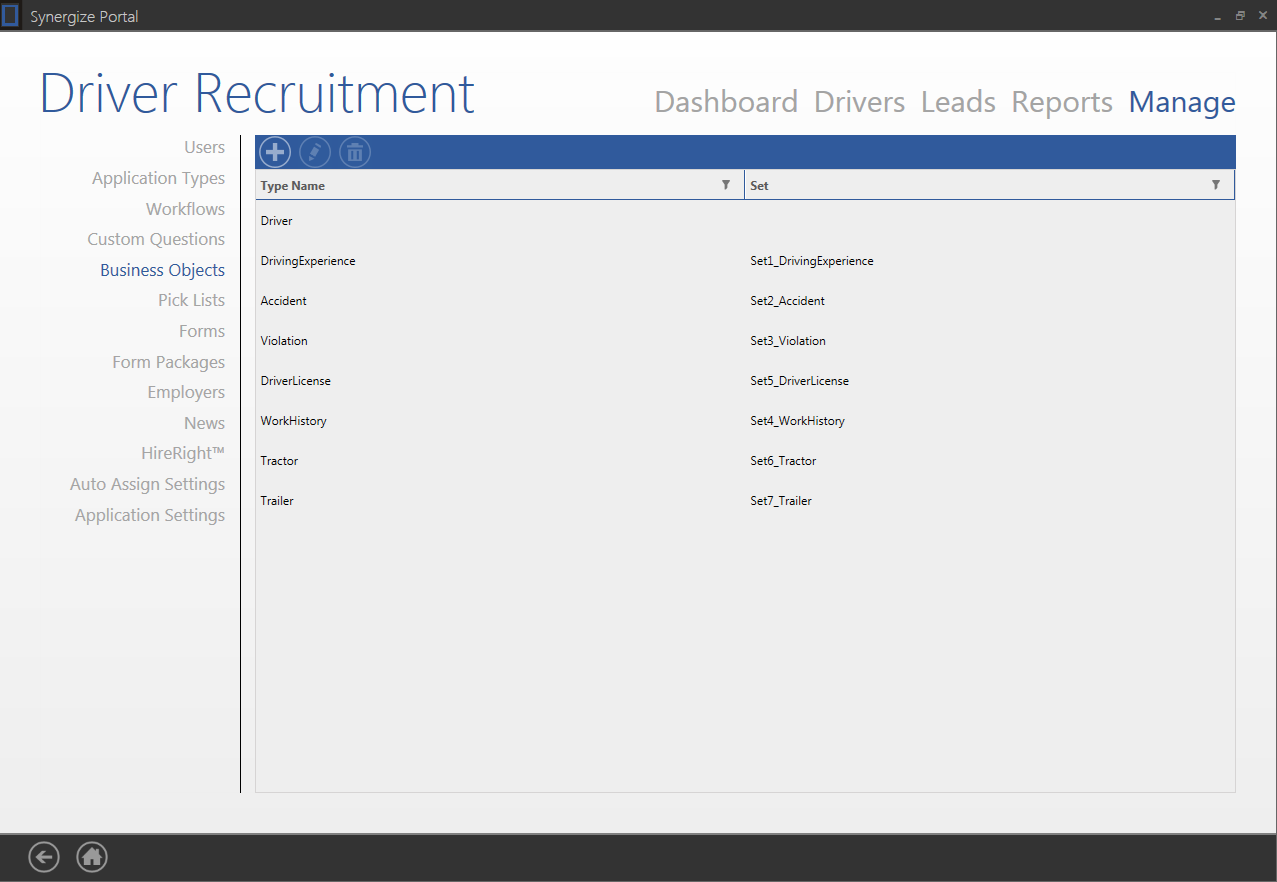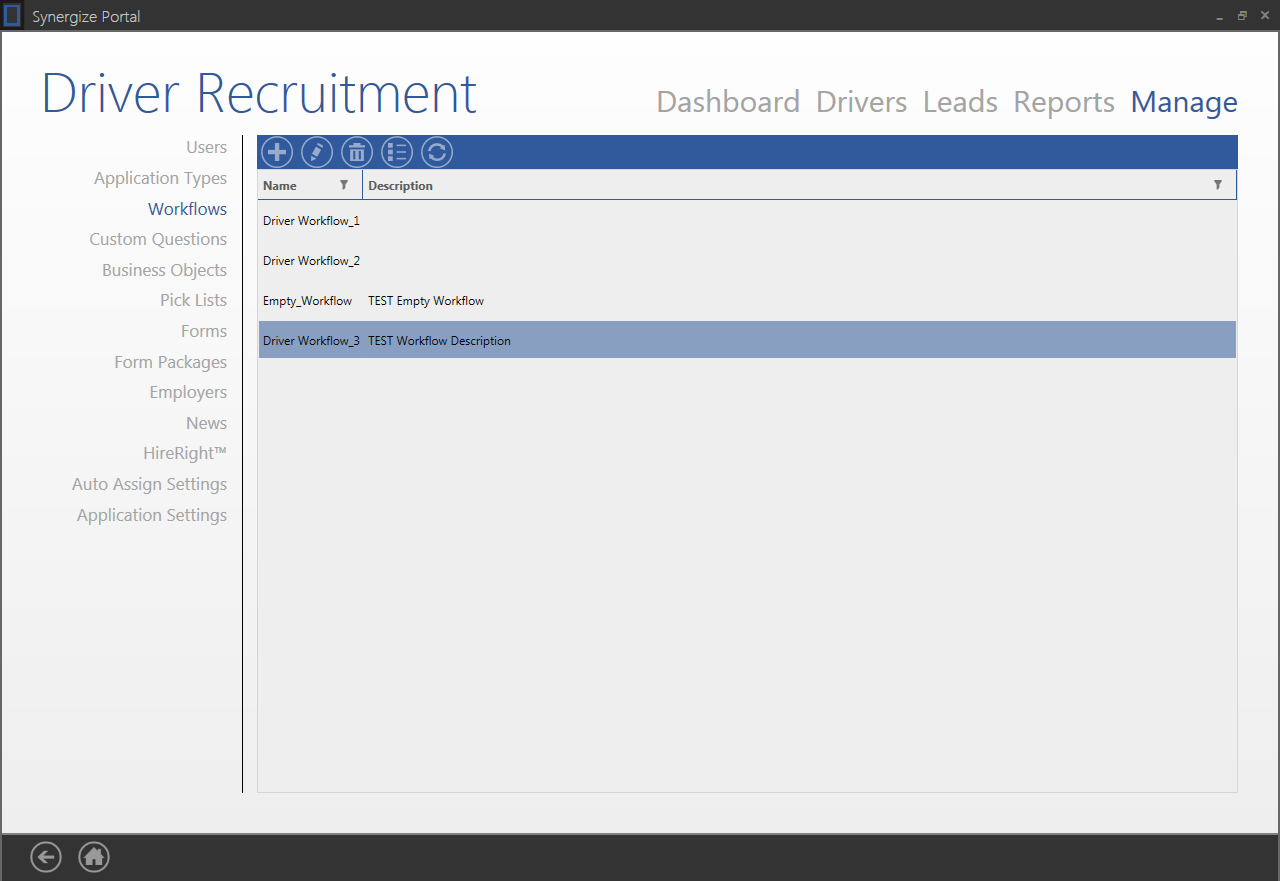 This article summarizes the top-level application views and tabs for Driver Recruitment. The initial screen, like all other main screens in Driver Recruitment, has the following main menu tabs: Dashboard, Drivers, Leads, Reports, Manage.