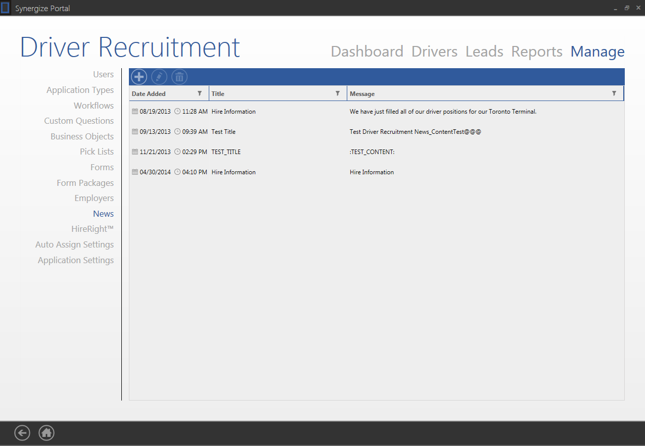 News: Allows an administrator to communicate news items to the recruitment staff with a date & time stamp for each message. The recruiter administrator can add, edit and delete news items from “Manage Tab: News”.