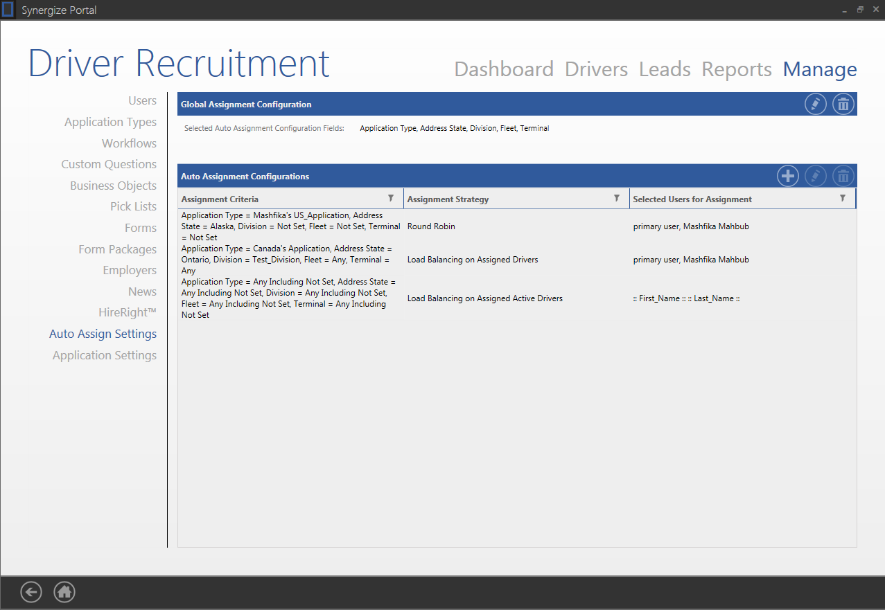 Example:Application Type and Terminal are configured globally. The rule for Application Type: American Driver and Terminal: Any with Recruiters: John, Peter and David using Assignment Strategy: Round Robin will take American Driver applications for any terminal and cycle through John, Peter, and David assigning applications to each of them in turn regardless of the number of drivers currently assigned to each of them.
