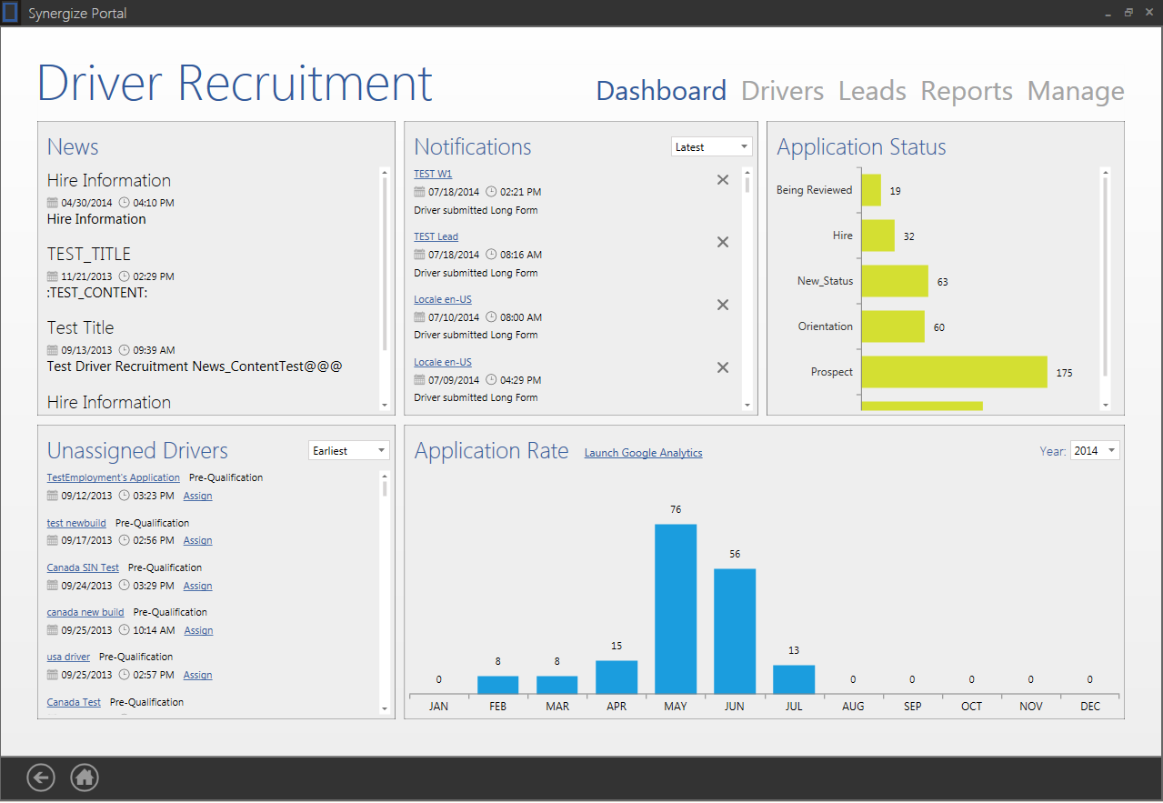 As a recruiter, the Dashboard tab of the Driver Recruitment Portlet is the first screen after logging in. The sections on this screen give an overall picture of all recruitment data.