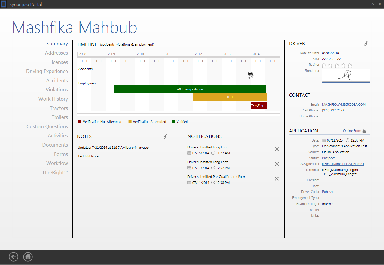 The summary page shows the driver's accidents, violations, and work histories plotted over time. Work histories are colored according to their status (Verified - Green, Verification Attempted - Yellow, Verification Not Attempted - Red). A recruiter can read or add notes associated with the driver in the Notes section. A Notifications section shows auto-generated notifications for several milestones that a driver goes through during the recruiting process.