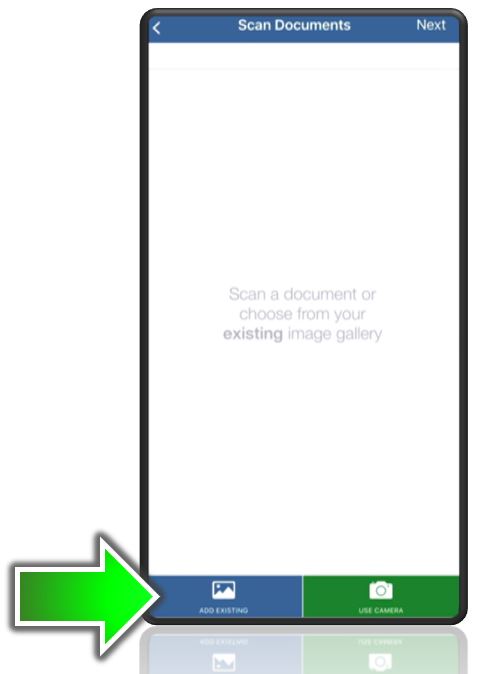 To add existing photos of documents saved on your mobile device, tap the blue ADD EXISTING button.
