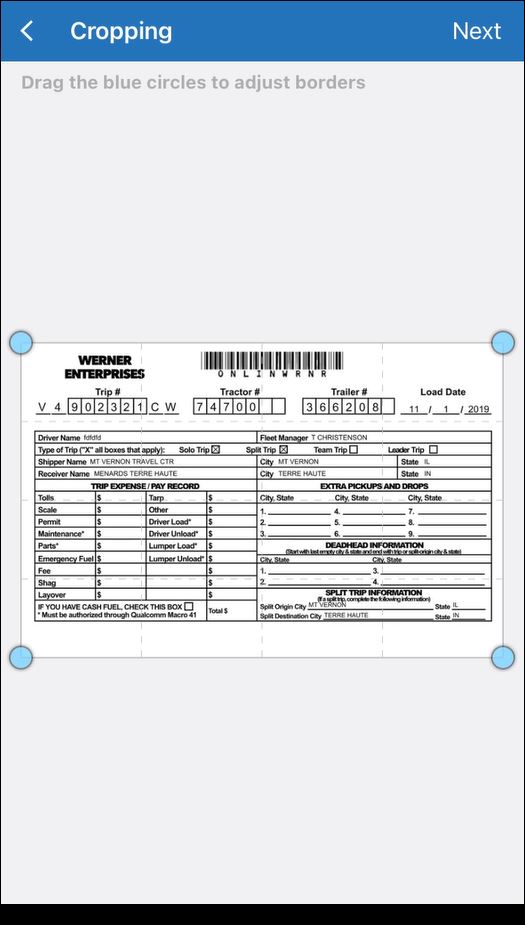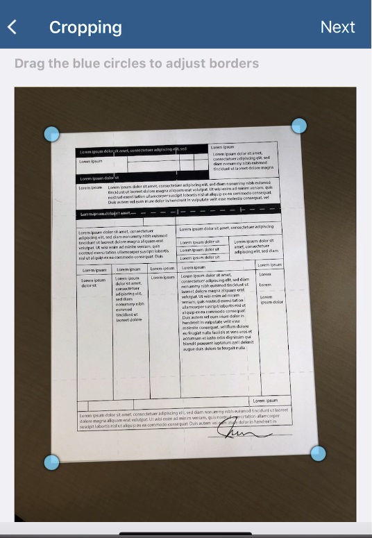 On the Cropping screen, drag the blue dots around the document corners to crop the image. Tap Next.