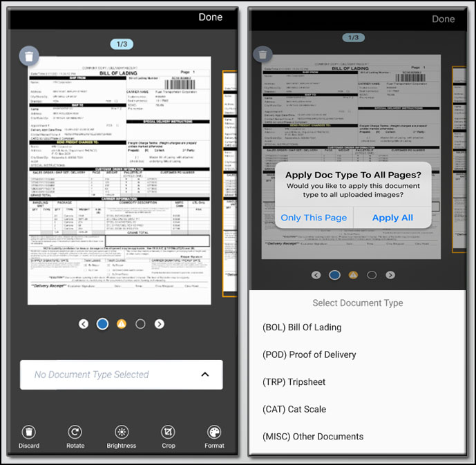 - Select the type of document (doc type) for each image. You can apply your choice of doc type to just the current page, for example page 1/3 (tap Only This Page) or to all images in your series (tap Apply All).