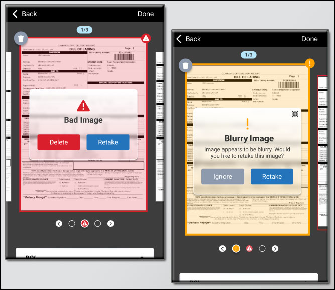 If an image is blurry or bad, you can tap Retake to capture a replacement image. If you tap Ignore, you can allow a blurry image (your upstream back-office processing team might or might not be able to read your blurry image). Bad images cannot be ignored; you must either retake them (replace with a new photo) or tap Delete to remove them from this temporary staging screen.