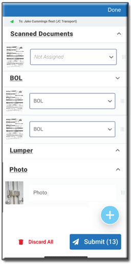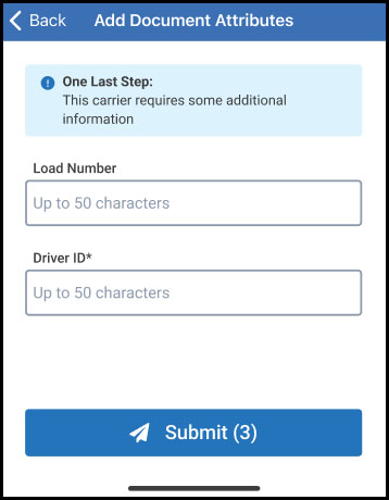 If configured by your carrier, enter any load attributes to help classify, identify, or audit this batch of documents. For example, enter a load ID or your driver ID. If an issue arises later, your office staff can contact the appropriate driver and trace the proper invoice and payment against the load ID. Tap Done.
