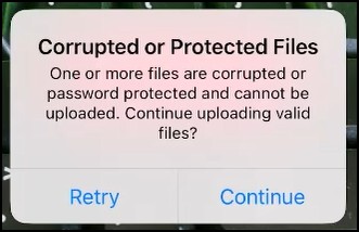 A similar message appears when you are about to upload a mix of good valid files and at least one bad apple. Corrupted or Protected Files: One or more files are corrupted or password protected and cannot be uploaded. Continue uploading valid files? In this scenario, choose one: