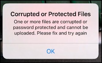 If they are locked with a password or corrupted, you might see the following message: Corrupted or Protected Files: One or more files are corrupted or password protected and cannot be uploaded. Please fix and try again.
