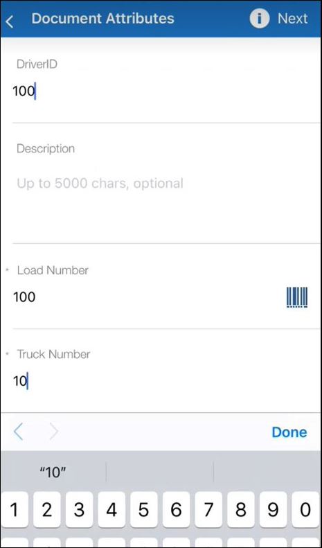 A Document Attributes screen might ask you to enter your driver ID, description, load or BOL number, and truck number. In some configurations, your driver ID is entered for you. Tap Next.