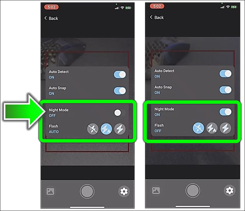 Similarly, if Night Mode is ON but then you set Flash to AUTO or ON, the app obeys your flash choice but turns Night Mode OFF for you with a reminder that Night Mode Requires Flash OFF. Decide which allowable choices work best for your current needs.