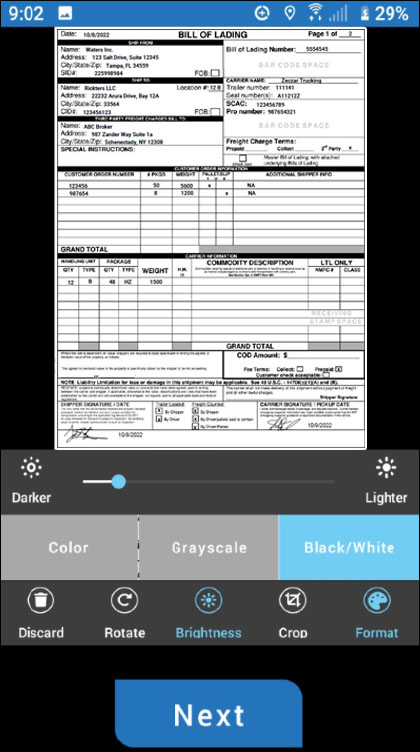 Tip 1: Many fleets take advantage of a global Transflo feature that automatically sets the document format based on the document type. For example, all invoices might be set to color and all BOLs might be set to black and white. In these environments, the Format button is hidden and you can safely continue to the next step.