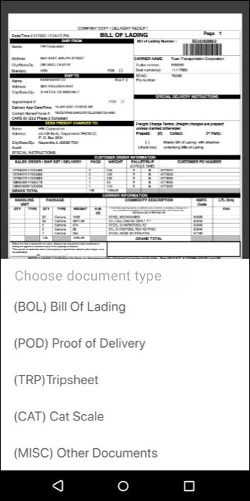 Search or swipe up, down, left, or right to locate your existing document. Options vary by device. You can select one document file at a time to add to your temporary list of load documents you are about to send. (Release 6.5 of the app removed the single file limit. You can now upload multiple pre-existing scanned documents all at the same time. See New! Upload Multiple Load Documents and PDF Files.)
