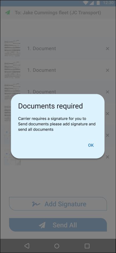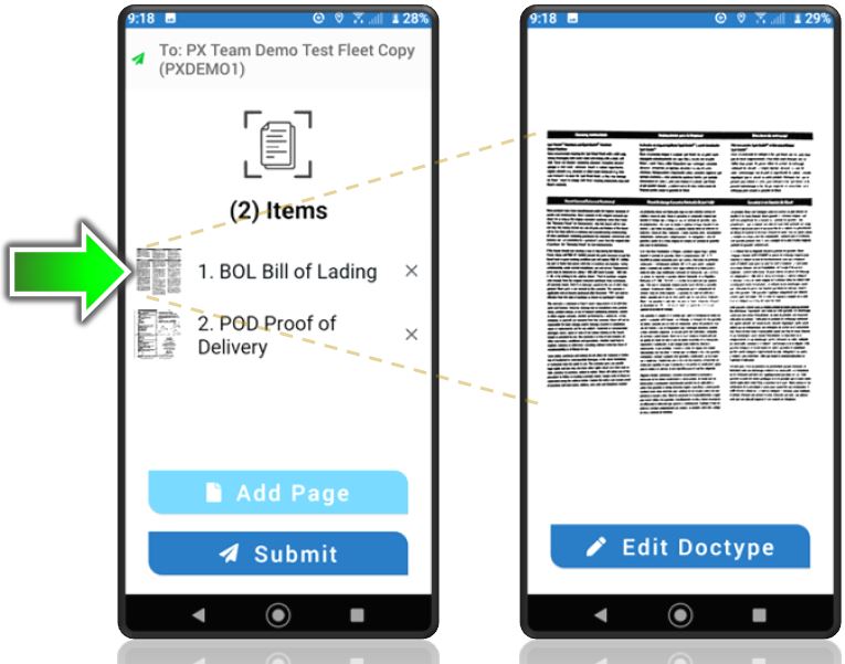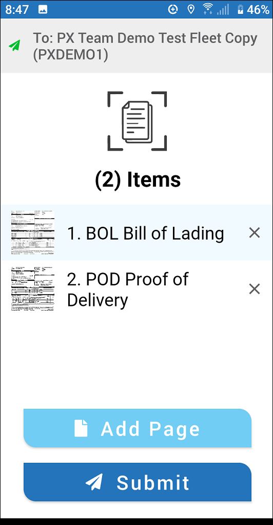 At this step, you have at least one document in the list. To add more document pages to send in this same batch for one or more loads, tap the Add Page button and repeat the steps above for adding existing documents or using the camera to capture new documents.