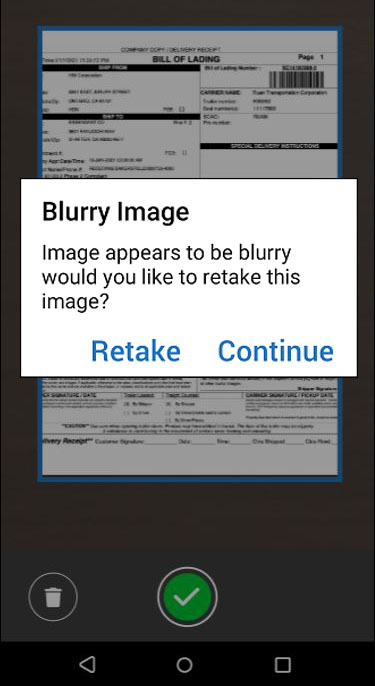 If the app detects a blurry image, you are prompted to keep it and continue or retake the photo.