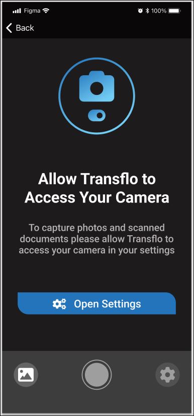 If prompted, tap Open Settings to open your mobile device operating system settings to allow camera access permissions for the Transflo Mobile app.