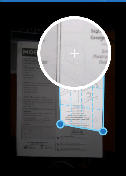 (Optional:) You can crop the detected preview of a live photo now (when you first capture the image) or crop it later. You can also crop an existing photo of a document you already scanned. To crop out unnecessary parts of the page, drag the blue dots or grab handles around the document at each corner to crop the image down to the exact size you want. As you move each corner, the area is enlarged in a preview circle for optimum precision.