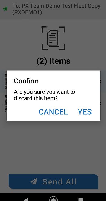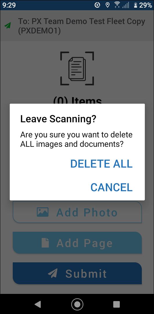 If you need to cancel all documents, exit the app. Exercise caution when using this feature. You might still have your existing images saved on your device but any recent items you just captured are deleted when you tap DELETE ALL. If you have the paper originals or copies, you can send them later.