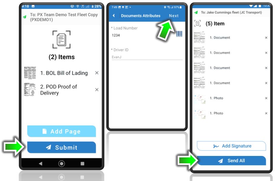 Use Both Methods: For example, you pickup a load in Denver and save a PNG image file of the eBOL. You drive to Cleveland and receive a PDF of the signed ePOD. You also receive a paper unloading (lumper) receipt. When you send your documents for this load, you take a live photo of the paper receipt and add the eBOL (PNG) and ePOD (JPG) files you already saved on your phone.