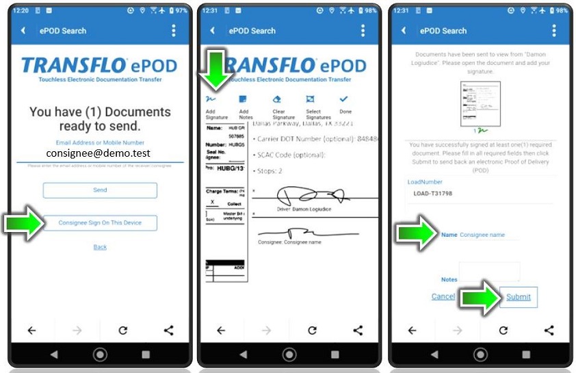 In some Transflo configurations, you can electronically send a signature request to someone, an authorized person can sign, and you receive the signed document back all electronically (no paper documents to scan).
