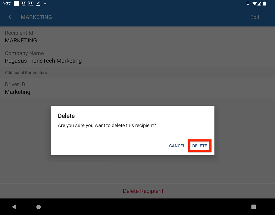 You can delete a previously defined recipient, fleet, or broker from your mobile app.