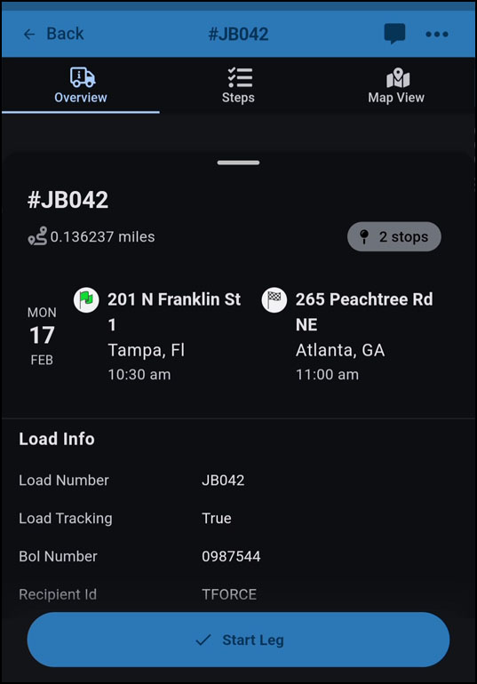 Follow up as needed. For example, after receiving a new LOAD ASSIGNED notification, navigate to the Loads feature and review the new load details or tap Start Leg.