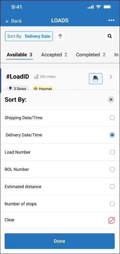 To sort the list by your choice of load data, tap the current filter, for example, Sort by Delivery Date and select one of the following sort options: