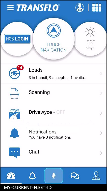Launch the Transflo Mobile+ app. (You can also use another supported driver app with the integrated Transflo Loads features running inside it, such as Transflo HOS, Geotab Drive, or your fleet app. Transflo Loads Workflow 2.0 is available as an API and mobile SDK.)