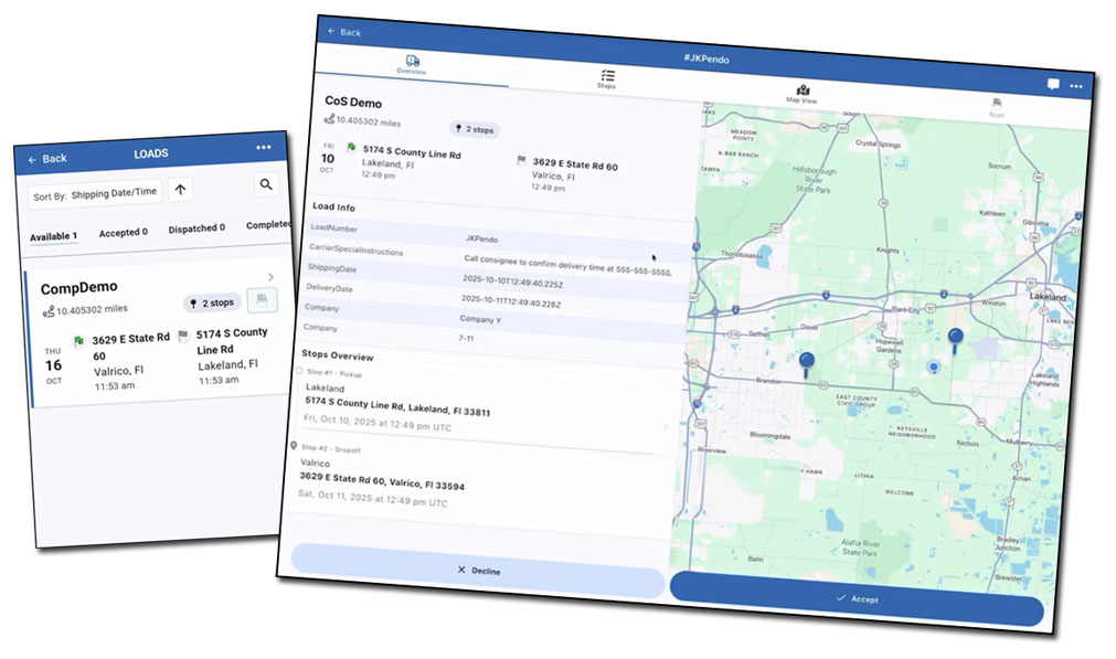 You can view the same load data on a smart phone, tablet, or special handsets (if configured). Although tablet screens present a larger viewing area and more content on their larger screens, the information and supported options (for example, zoom in or out on the map view) are the same on any device.